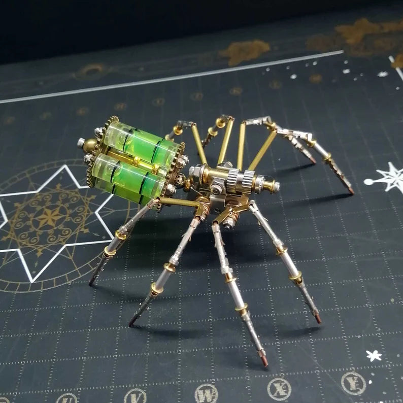 Once assembled, the mechanical spider features multiple moving joints and leg mechanisms that simulate realistic crawling and walking motions.