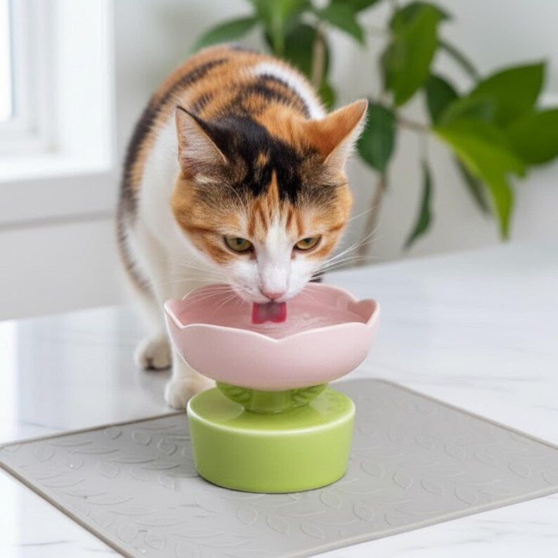 Raised ceramic base shaped like a blooming flower lifts the bowl to a comfortable height, reducing neck strain and improving digestion.