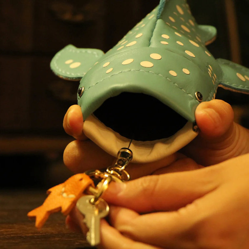 Handcrafted leather key pouch shaped like a junior whale shark. Adorable and functional—holds keys, cards, and small essentials.
