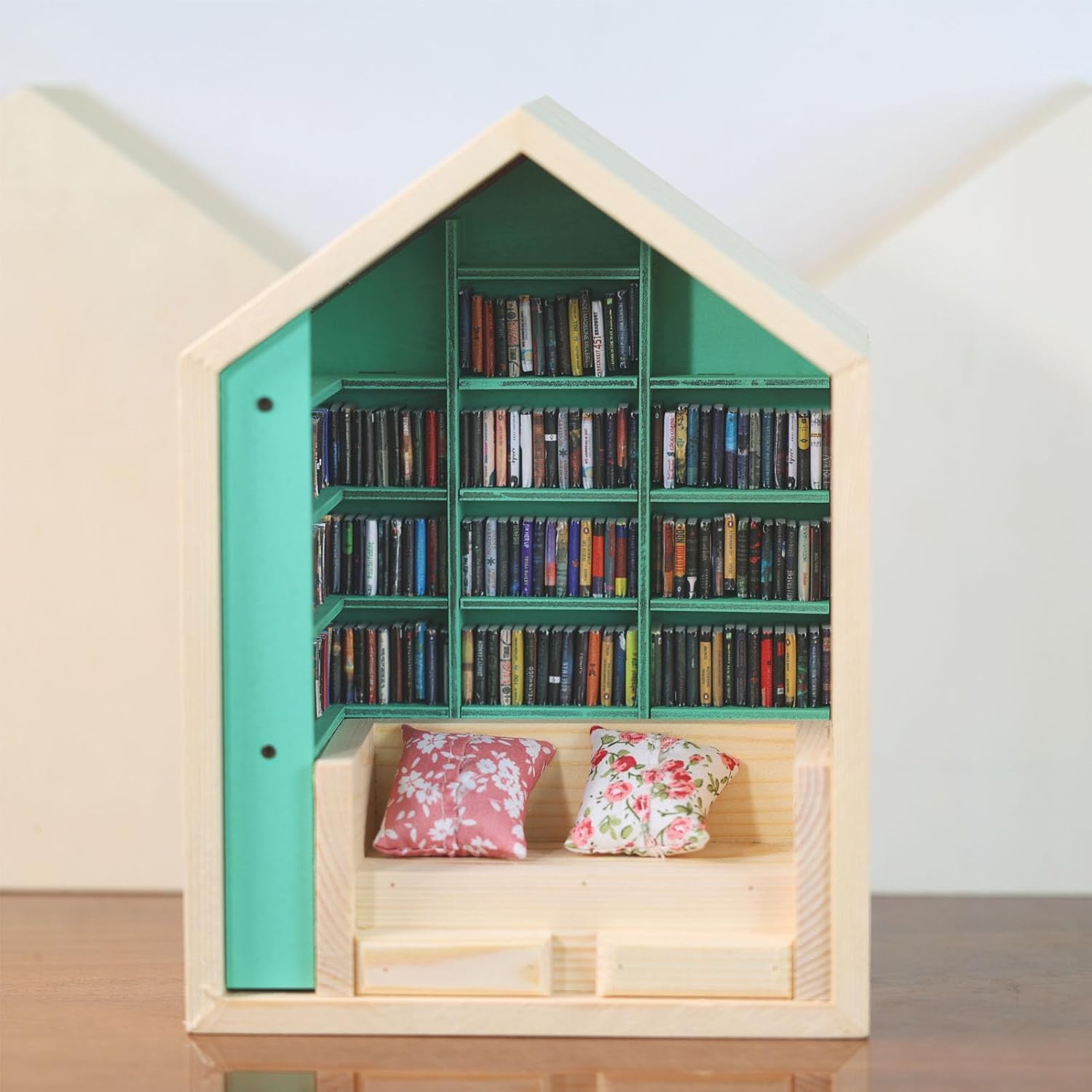 The mini bookshelf is designed to hold up to 200 different books, adding a touch of artistry to any room. This handmade piece is meticulously detailed, making it a perfect focal point for any space, resembling a miniature dollhouse.